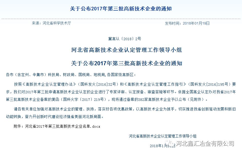 2018年1月19日,經河北省高新技術企業認定管理辦公室組織專家評審、公示等程序后,我公司順利通過國家高新技術企業認定,成為高新技術企業。