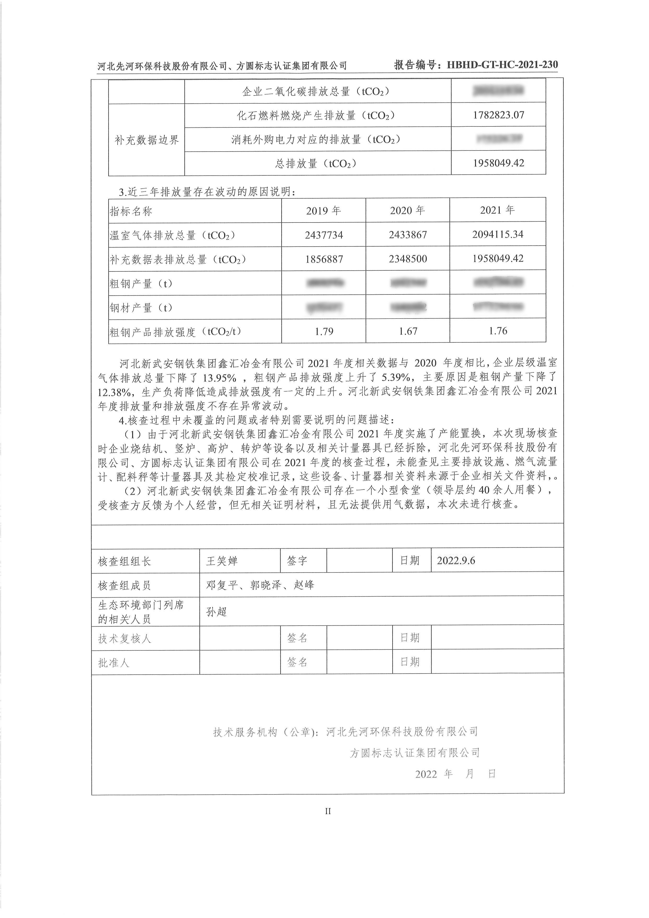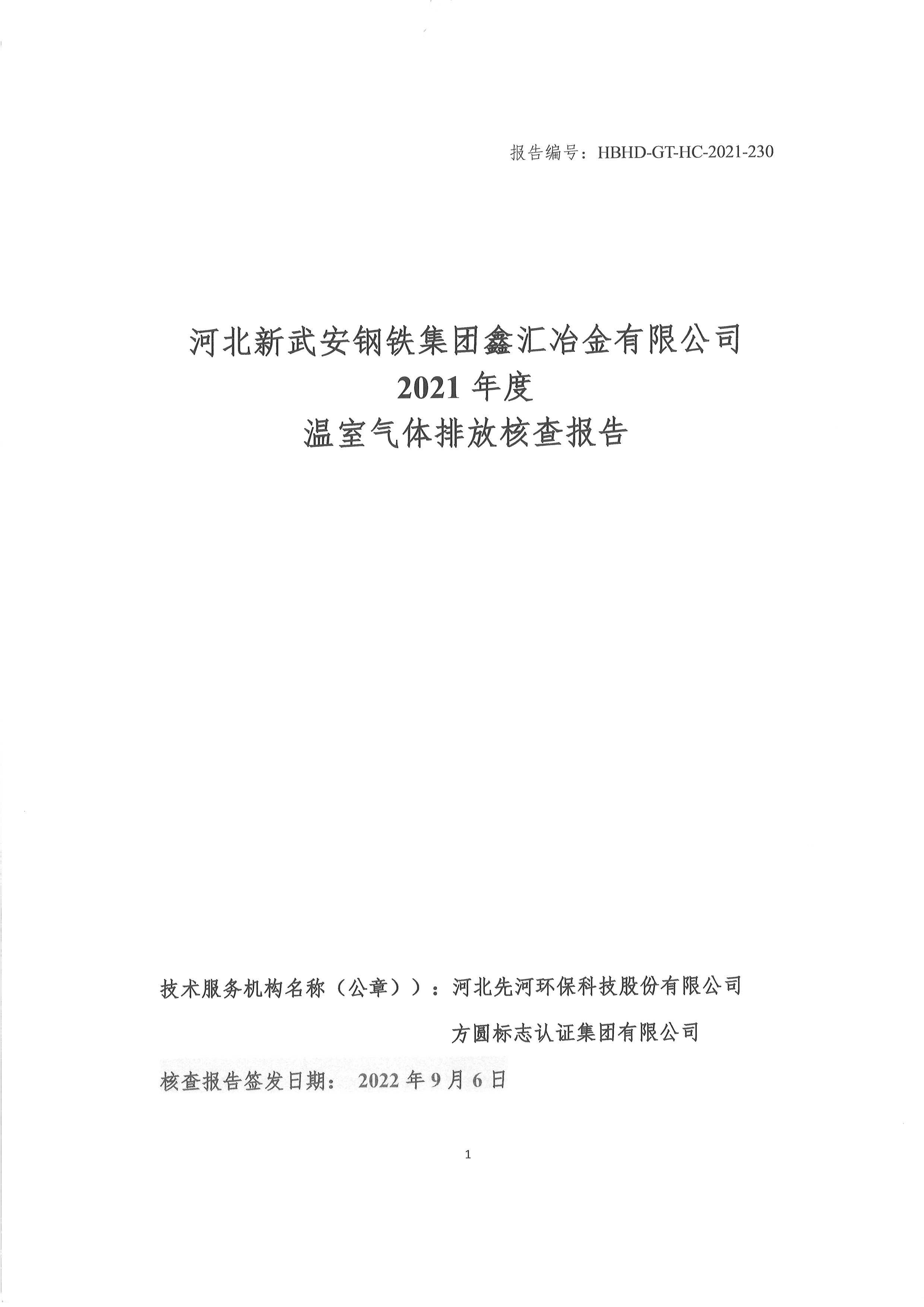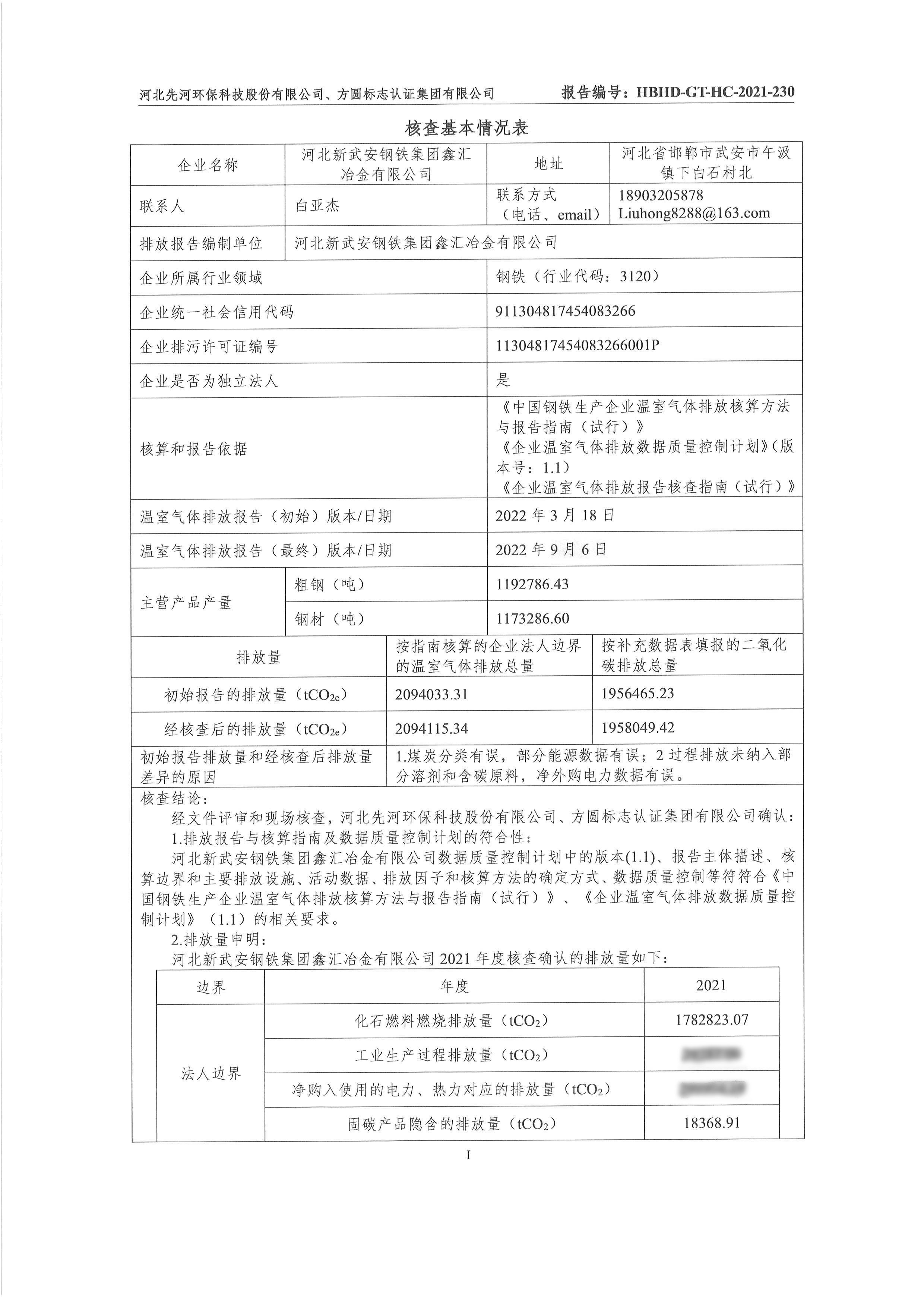 2021年河北新武安鋼鐵集團鑫匯冶金有限公司碳排放核查報告