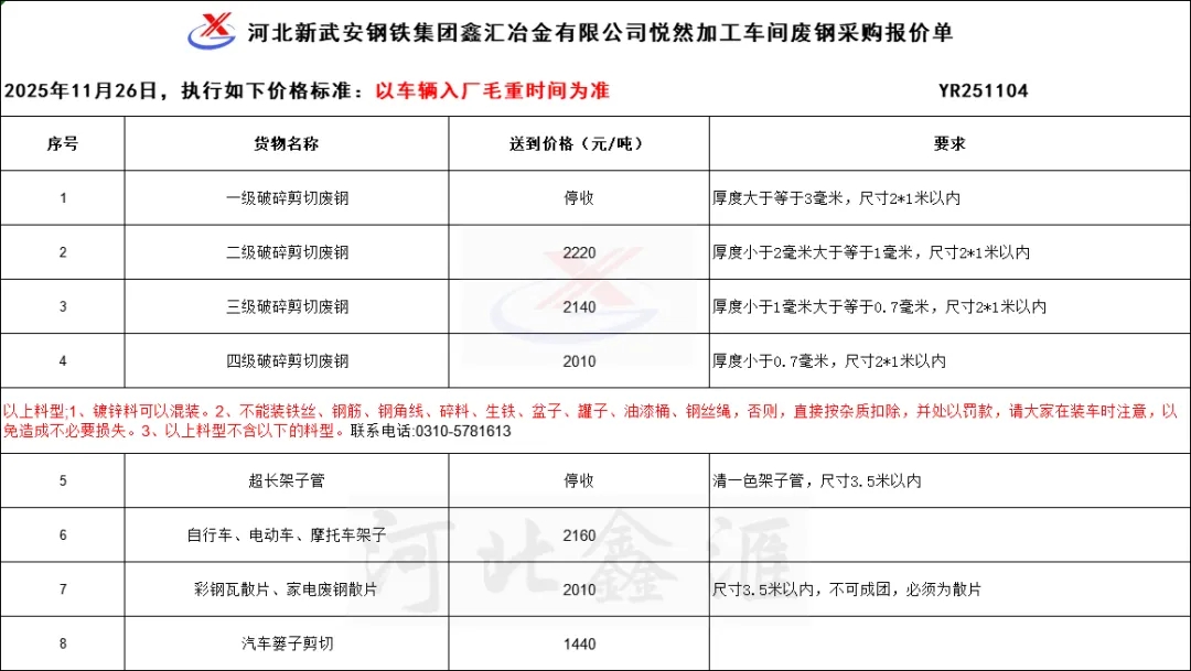 各位鋼友,為了你們切身利益,也為了我公司的經營聲譽,切勿通過鋼販子出售廢鋼,鋼販子隨意扣雜,隨意欠你們貨款,給您們造成的經濟損失,本公司不承擔任何責任也不提供任何保證,只有面對我公司出售,你們的利益才能最大化,經濟才能不受損失。望各位鋼友明事理,懂道理,維護好自己的利益!